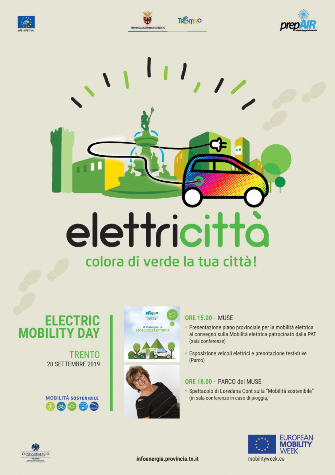 La Settimana Europea della Mobilità, iniziata ieri in tutt'Europa e promossa dalla Commissione Europea, si concluderà il 22 settembre. Il tema dell'edizione di quest'anno è la mobilità pedonale e ciclabile. Grazie al sostegno del Progetto Europeo Life Prepair, il 20 settembre sarà una giornata dedicata alla mobilità elettrica. In Trentino, al MuSe, con il patrocinio della Provincia autonoma saranno organizzati da Neogy (Dolomiti Energia e Alperia) alcuni eventi sia per gli operatori del settore sia per i privati cittadini. Alle 15 sarà presentato a cura della Provincia autonoma il Piano della Mobilità elettrica con l'intervento del vicepresidente e assessore all'ambiente Mario Tonina. Alle 18 lo spettacolo di e con Loredana Cont grazie all'intervento di Progetto Prepair. Lo spettacolo è gratuito e aperto a tutti.