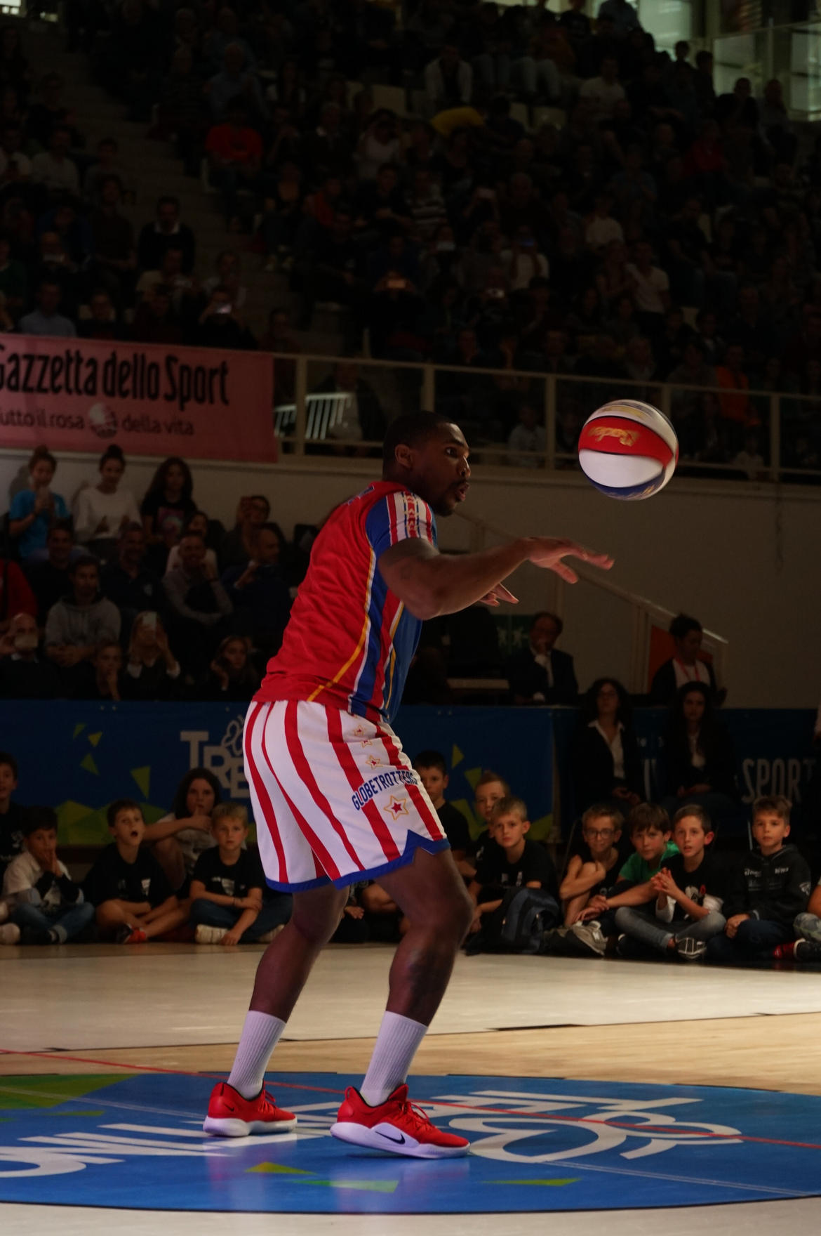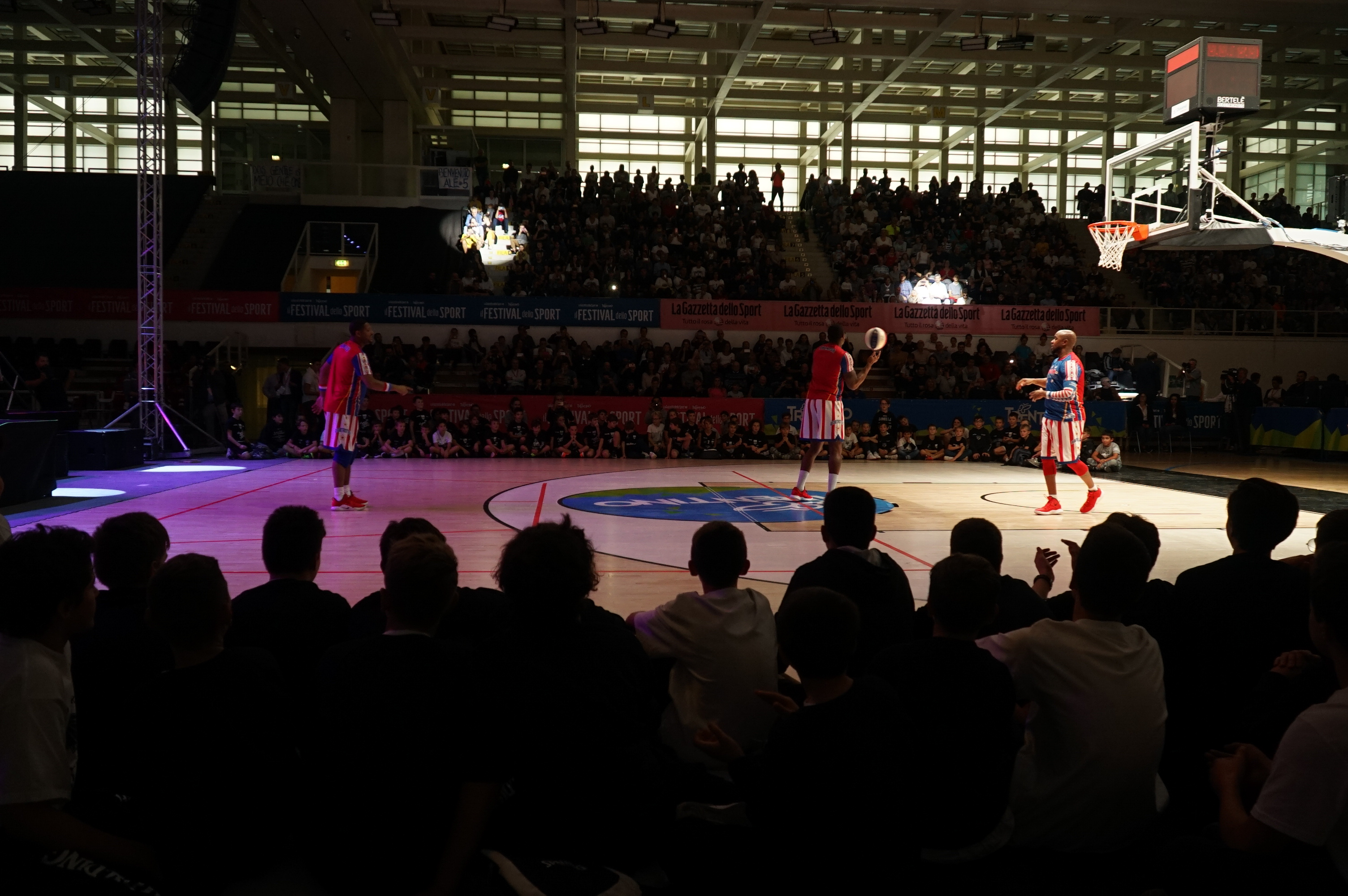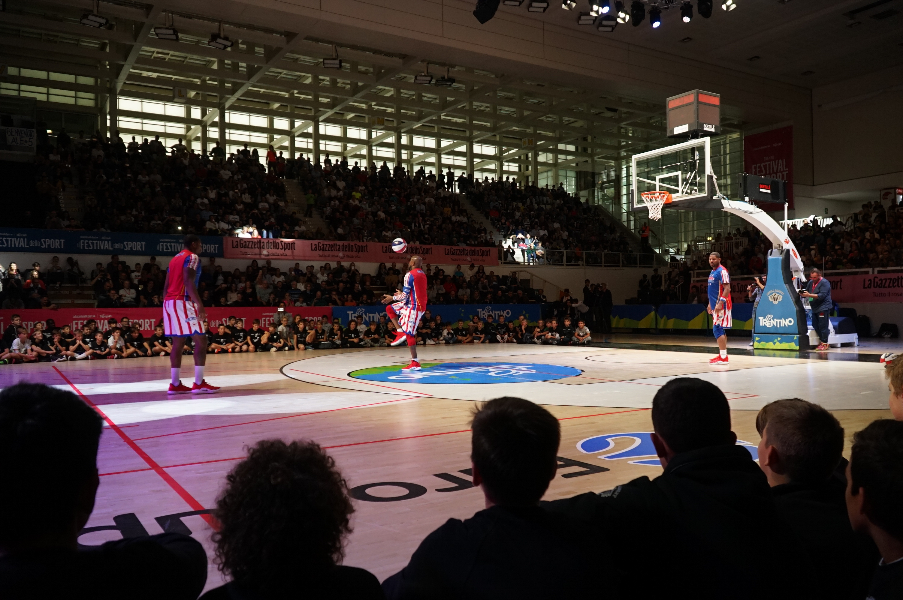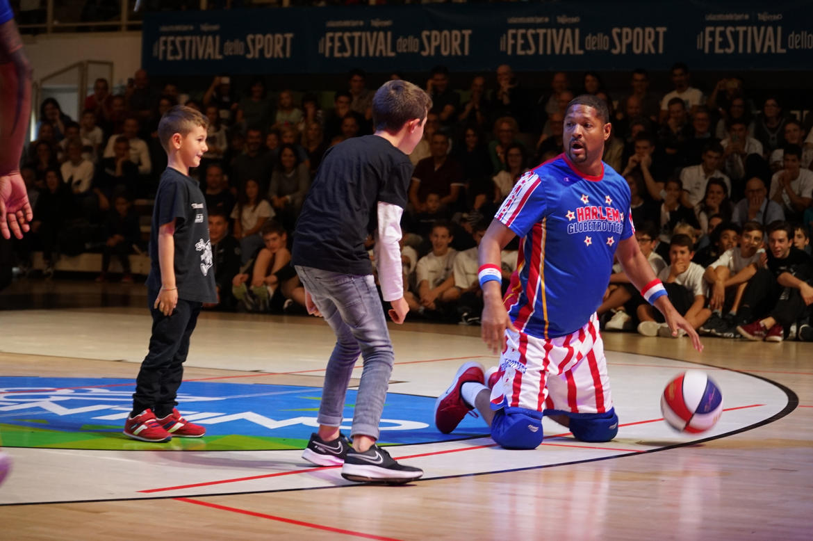 Questa volta il palco è stato allestito al centro della Blm Group Arena. E ci sono saliti coach Sweet Lou Dunbar e tre funamboli della squadra di basket più pazza del mondo, gli Harlem Globetrotters, squadra-spettacolo degli afroamericani, nata nel lontano 1927, prima dell’NBA, che è del 1946, e protagonista di gare ed esibizioni in oltre 120 Paesi del mondo. Al Festival dello Sport sono stati accolti e presentati da «The Coach» Dan Peterson, che ne ha raccontato la storia, grazie ad alcuni video. Introdotti dall’intervista dei giornalisti della Gazzetta Davide Chinellato e Simone Sandri, si sono poi esibiti in palleggi al limite delle leggi della fisica, sottomano, acrobazie con il pallone sulle dita, sulla testa. Veri giocolieri della palla a spicchi, che in un secolo di storia sono riusciti a introdurre i loro numeri anche nel basket agonistico, come l’alley oop.
