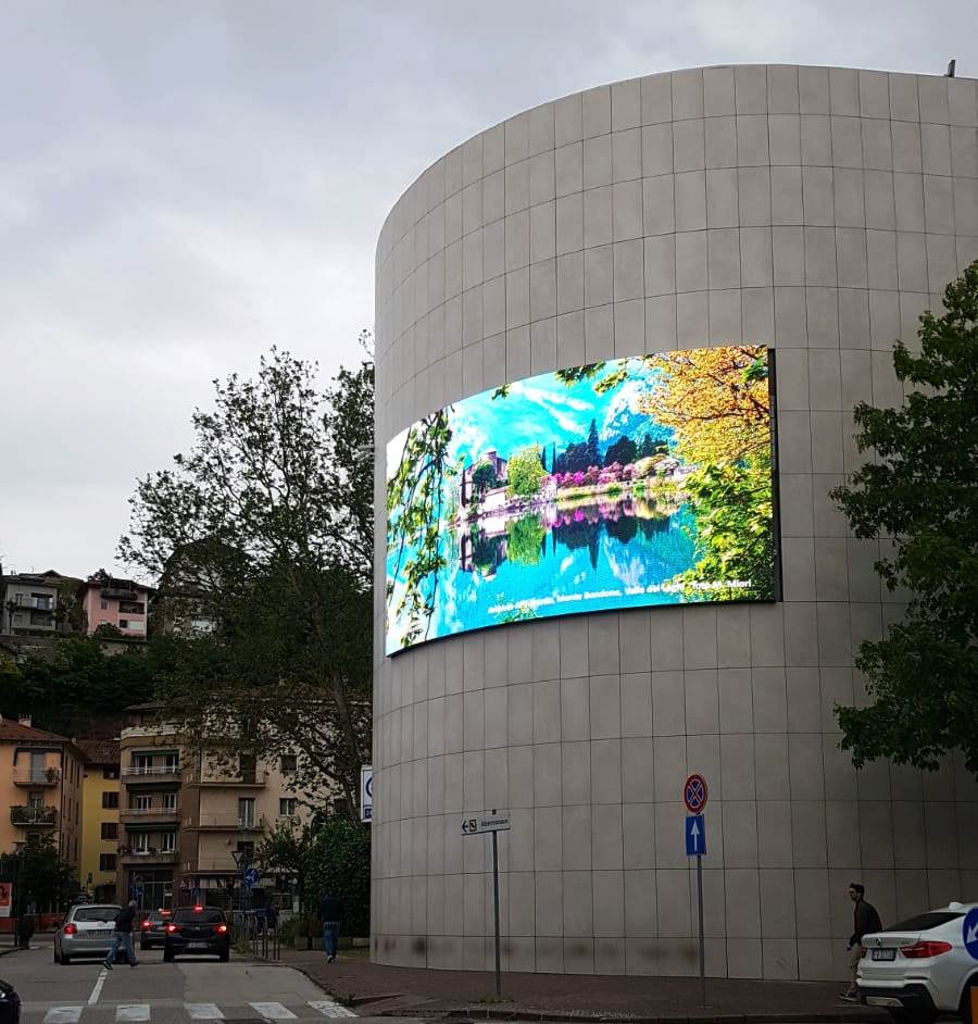 Il maxischermo è lungo 9,60 metri per 4,80, per una superficie complessiva di oltre 46 metri quadrati. La tecnologia di proiezione è a led ad alta luminosità, collocati ad un passo di 0,8 centimetri a beneficio di una qualità di riproduzione molto elevata. Installato a 7 metri di altezza dal marciapiede, lungo la parete nord della struttura, ha richiesto una progettazione particolare proprio per la superficie ricurva dell’Autosilo alla quale il maxischermo aderirà.La progettazione architettonica e impiantistica, nonché la Direzione Lavori, sono state curate dall'ing. Antonio Armani già co-progettista del Giardino verticale posto sulla torre sud dell’Autosilo, dello Studio tecnico Interstudio Ingegneri Associati di Trento. La produzione del pannello e delle strutture di supporto e installazione sono state curate dalla Art Tech di Villar Dora (Torino).