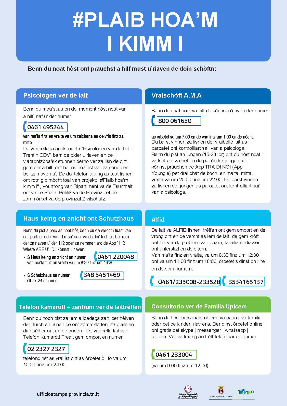 Benns du moa’st as en doi moment hòst noat van a hilf, riaf u’ der numer 0461 495244 van ma’ta finz en vraita va um zeichena en de vria finz za mitto. De vraibellega auskenneta “Psicologen ver de lait – Trentin ODV” barn de bider u’riaven en de viaraontzboa’sk stunnen derno ver za lisn de ont gem der a hilf, ont benns noat ist ver za song der ber za riaven u’. De doi telefonlaitung as tuat lisnen ont rotn gip mòcht toal van projekt: "#Plaib hoa’m i kimm i" , vourtrong van Dipartiment va de Tsunthait ont va de Sozial Politik va de Provinz pet de zòmmòrbet va de provinzal Zivilschutz.