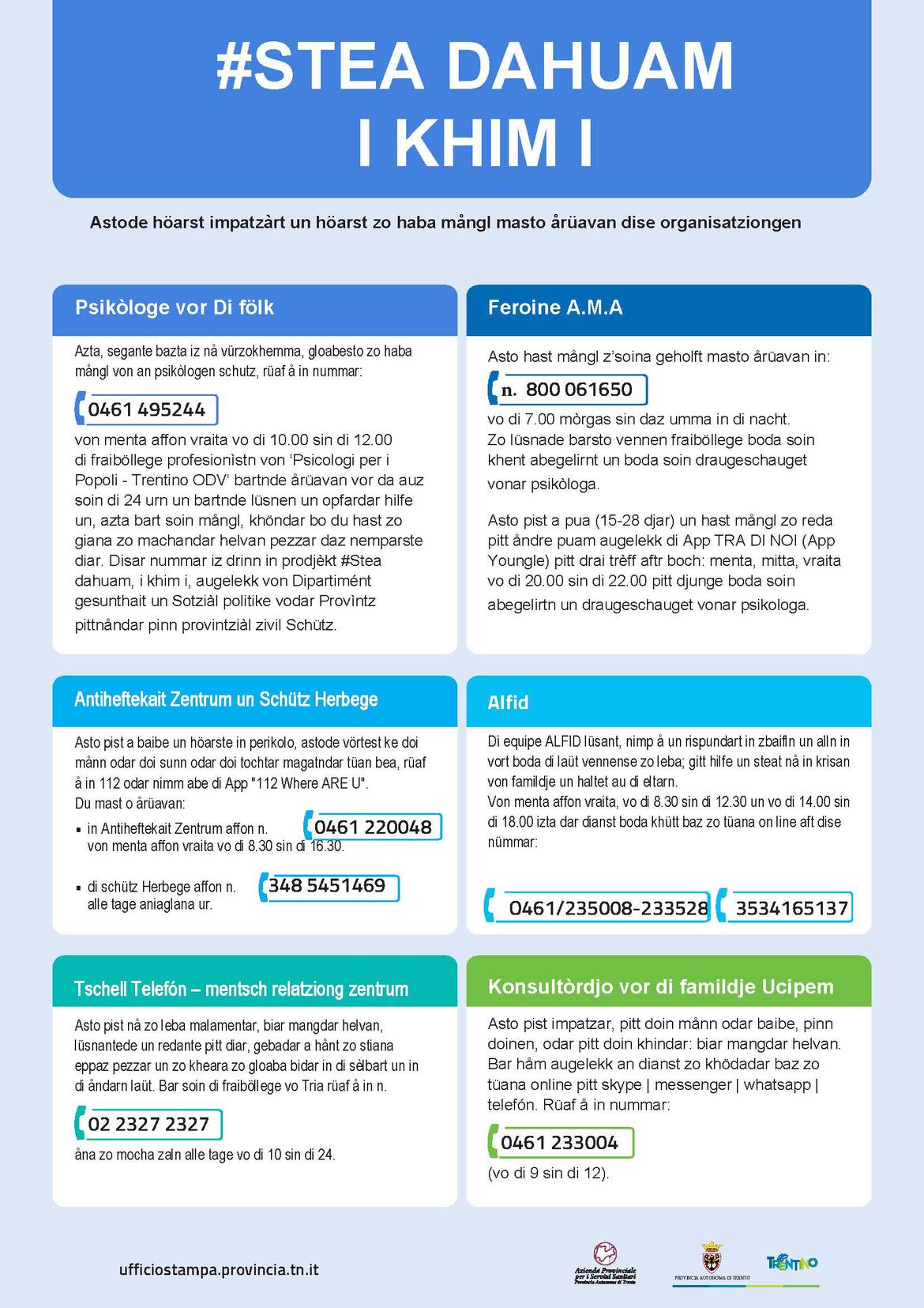 Azta, segante bazta iz nå vürzokhemma, gloabesto zo haba mångl von an psikòlogen schutz, rüaf å in nummar 0461 495244 von menta affon vraita vo di 10.00 sin di 12.00 di fraiböllege profesionìstn von ‘Psicologi per i Popoli - Trentino ODV’ bartnde årüavan vor da auz soin di 24 urn un bartnde lüsnen un opfardar hilfe un, azta bart soin mångl, khöndar bo du hast zo giana zo machandar helvan pezzar daz nemparste diar. Disar nummar iz drinn in prodjèkt #Stea dahuam, i khim i, augelekk von Dipartimént gesunthait un Sotziàl politike vodar Provìntz pittnåndar pinn provintziàl zivil Schütz