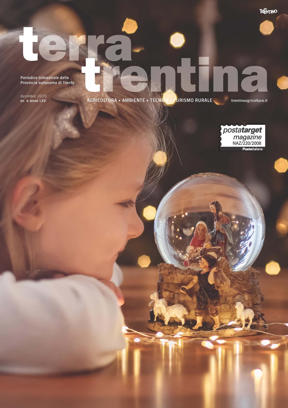 Sarà a breve nelle case dei suoi abbonati il quarto numero di "Terra Trentina", periodico della Provincia che parla di agricoltura, ambiente e turismo. Anche in questo numero vi è l'emergenza Coronavirus attraverso alcuni approfondimenti che vanno da #RipartiTrentino, ovvero le misure messe in campo dalla Giunta provinciale per la ripartenza, ai progetti delle aziende agricole trentine per rispondere al Covid. Spazio poi ai prodotti a km zero, all'olio del Garda e ai tanti premi ricevuti dai vini trentini. In sommario, tra gli argomenti di attualità, la Tempesta Vaia, le storie e le emozioni di chi investe in sviluppo rurale, il maltempo di ottobre, il progetto sui mirtilli e il suolo del Liceo da Vinci. Come sempre alcune pagine della rivista sono dedicate ai contributi tecnici e scientifici curati da FEM con il progetto per mappare le api selvatiche e la tecnica dell'insetto sterile. Completano il numero le rubriche, fra cui la nuova proposta de "L'agricoltura eroica" dedicata a chi coltiva il nostro territorio in condizioni difficili.