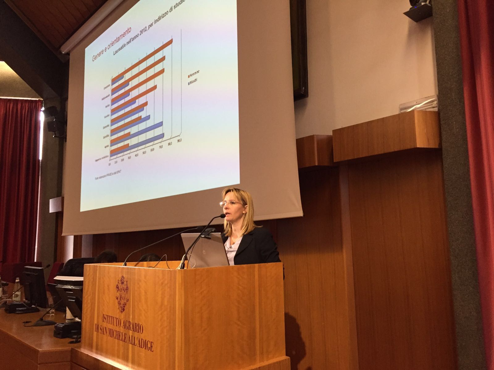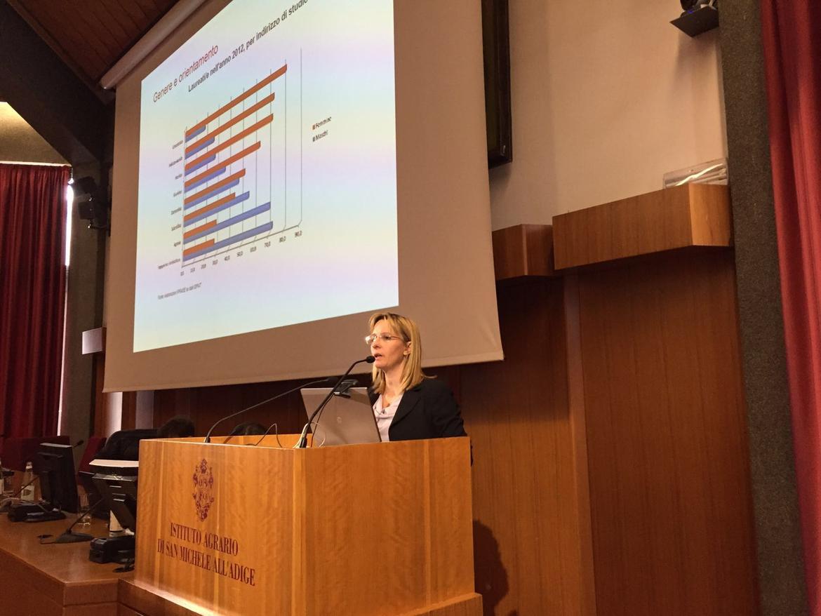 Gabriele Fauri, responsabile di DG-Ripartizione Organizzazione e Risorse Umane FEM, ha esposto le azioni implementate da FBK nella direzione della conciliazione lavoro/famiglia per chi lavora in Fondazione. Valeria Gualandri, tecnologa presso il CTT della FEM, ha raccontato la sua personale esperienza di mamma e donna di scienza. Valeria ha una grande famiglia si destreggia tra attività di servizio e di ricerca nel campo della patologia vegetale presso il Centro di Trasferimento Tecnologico della Fondazione Edmund Mach e fa del suo essere mamma una scommessa per il suo lavoro. “Perchè lavoro e maternità non sono percorsi di vita inconciliabili”.