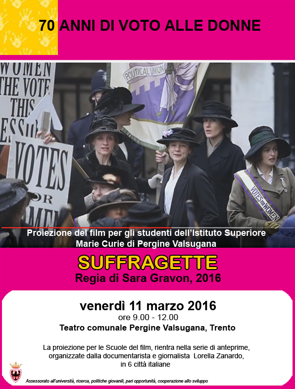 Dopo la visione del film, ci sarà spazio per discutere con Lorella Zanardo sull’importanza dell’impegno civile per la difesa di diritti fondamentali, come la parità di genere, che spesso vengono dati erroneamente per scontati. Un grande affresco cinematografico, il film “Suffragette” racconta la lotta che portò alla conquista del diritto di voto per le donne nel Regno Unito d’inizio Novecento. Il film della regista Sarah Gavron, e con un cast tutto al femminile, distribuito in Italia da BIM a partire dal 3 marzo, ha dato il via ad un profondo dibattito sullo status dei diritti acquisiti ad oggi dalle donne. Meryl Streep, Carey Mulligan, Helena Bonham, Ben Whishaw, Anne Marie Duff, Brendan Gleeson e Romola Gai hanno prestato il volto ai protagonisti di quegli anni di lotta nel Regno Unito. Lorella Zanardo è attivista, documentarista, scrittrice, blogger.