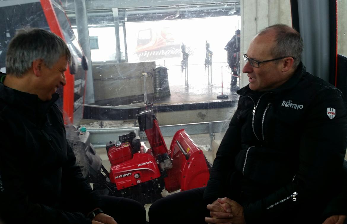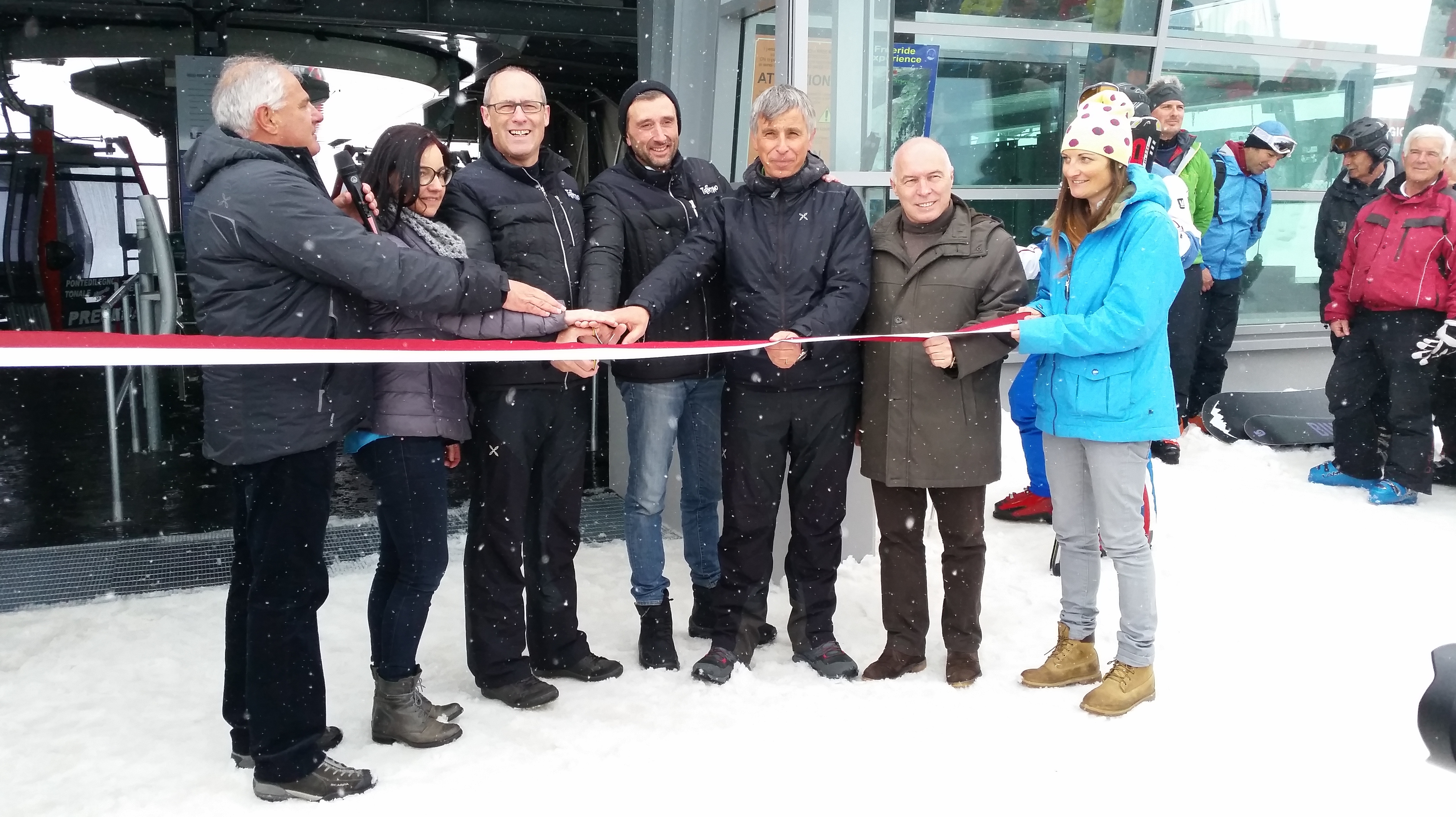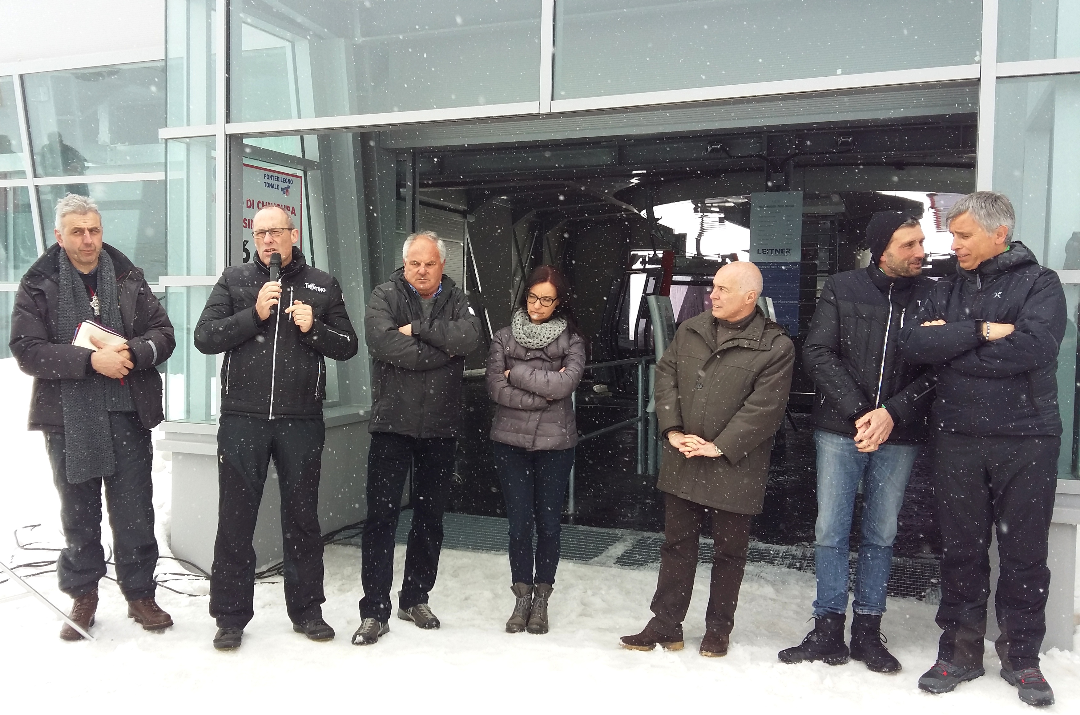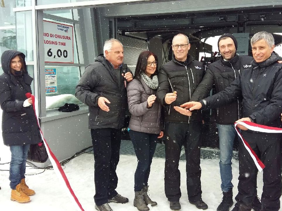 Si respirava davvero un clima positivo stamani a passo Tonale, dove si è svolta la simbolica inaugurazione della nuova telecabina, a cui si aggiungerà anche un nuovo rifugio e un punto di ristorazione. La mattina è iniziata con un ritrovo a 3.000, nella stazione a monte dell'infrastruttura, che consente di abbracciare con uno sguardo un panorama maestoso, sull'uno e l'altro versante del crinale montuoso, oggi solo parzialmente occultato dalle nuvole. Successivamente, ci si è spostati a passo Paradiso, per il taglio del nastro e la tradizionale benedizione dell'impianto. La cabinovia è stata aperta già nel novembre scorso, "e quando sono venito a visitarla - ha detto ancora Rossi - ho capito che cosa possa avere significato realizzare un'opera del genere quassù. Un grazie quindi a chi l'ha costruita, a chi ci ha creduto, ma anche a Trentino Sviluppo che ci ha messo competenza e risorse, e a Trentino Marketing che ci aiuta a farla conoscere".